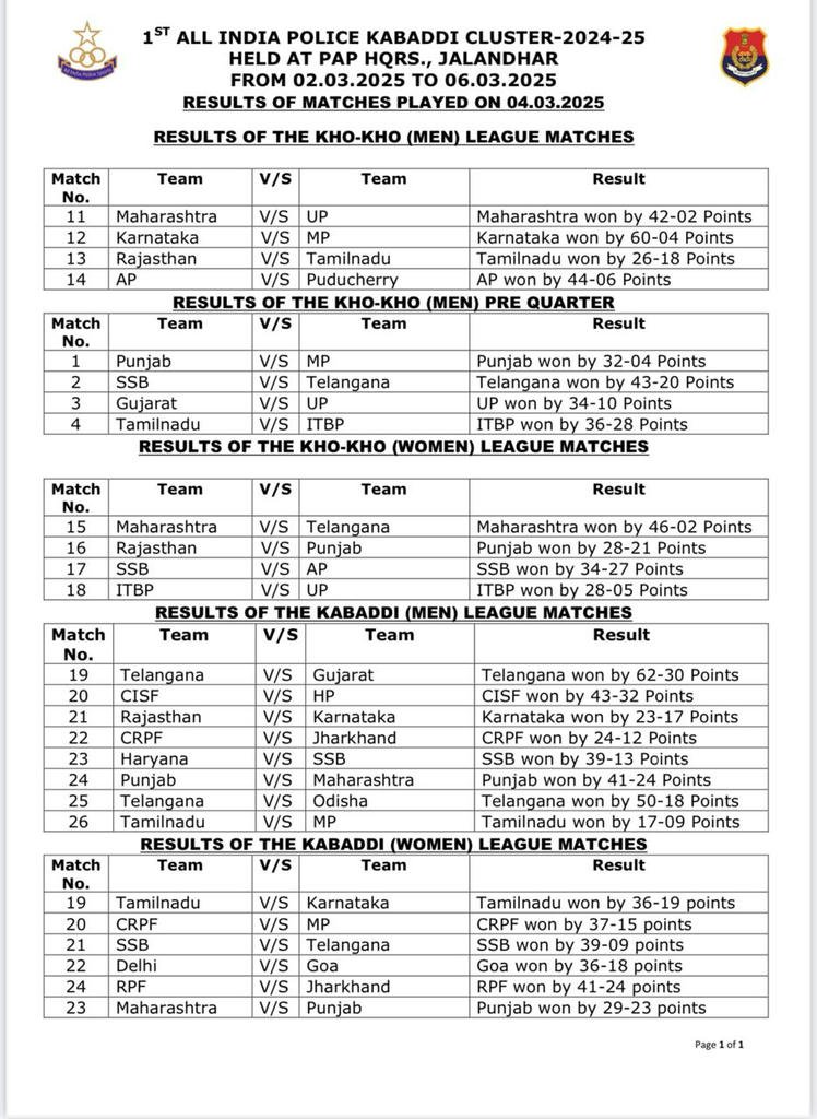 DoabaIndiaअखिल भारतीय पुलिस कबड्डी क्लस्टर- 2 मार्च लेकर से 6 मार्च, तक होने वाले मैचों के रिजल्ट । City Tez KhabarMarch 5, 202501 mins जालंधर (सिटी तेज़ खबर ब्यूरो) अखिल भारतीय पुलिस कबड्डी क्लस्टर- 2 मार्च लेकर से 6 मार्च, तक होने वाले मैचों के रिजल्ट कुछ इस प्रकार है। Post navigation Previous: पहला अखिल भारतीय पुलिस कबड्डी क्लस्टर- 2 मार्च लेकर से 6 मार्च, तक पीएपी में होगा ।Next: ਪਹਿਲਾ ਆਲ ਇੰਡੀਆ ਪੁਲਿਸ ਕਬੱਡੀ ਕਲੱਸਟਰ-2024-25 ਹੋਇਆ ਸਮਾਪਤ। Leave a Reply Cancel replyYour email address will not be published. Required fields are marked *Comment * Name * Email * Website Save my name, email, and website in this browser for the next time I comment.