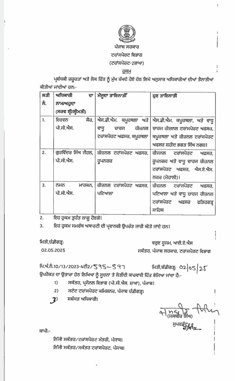 ChandigarhIndiaਪੰਜਾਬ ਦੇ 3 ਜ਼ਿਲ੍ਹਿਆਂ ਦੇ RTOs ਬਦਲੇ। City Tez KhabarMay 3, 202501 mins ਚੰਡੀਗੜ੍ਹ (ਸਿਟੀ ਤੇਜ਼ ਖ਼ਬਰ ਬਿਊਰੋ) ਪੰਜਾਬ ਸਰਕਾਰ ਨੇ ਹੁਕਮ ਜਾਰੀ ਕਰਦਿਆ ਪੰਜਾਬ ਦੇ 3 ਜ਼ਿਲ੍ਹਿਆਂ ਦੇ RTOs ਬਦਲ ਦਿੱਤੇ ਹਨ। Post navigation Previous: ਯੁੱਧ ਨਸ਼ਿਆਂ ਵਿਰੁੱਧ’ ਮੁਹਿੰਮ ਤਹਿਤ ਜਲੰਧਰ ਪ੍ਰਸ਼ਾਸਨ ਨੇ ਦਵਾਈਆਂ ਦੀ ਅਣ-ਅਧਿਕਾਰਤ ਵਿਕਰੀ ਖਿਲਾਫ਼ ਸ਼ਿਕੰਜਾ ਕੱਸਿਆ।Next: ਕੈਬਨਿਟ ਮੰਤਰੀ ਮਹਿੰਦਰ ਭਗਤ ਗੁਰਕੰਵਲ ਦੇ ਘਰ ਗਏ ਅਤੇ ਵਧਾਈ ਦਿੱਤੀ। Leave a Reply Cancel replyYour email address will not be published. Required fields are marked *Comment * Name * Email * Website Save my name, email, and website in this browser for the next time I comment.