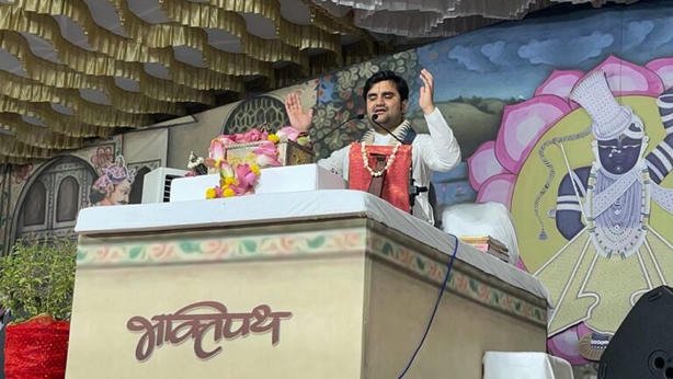 श्रीमद्भागवत कथा में छठवें दिन हुआ कृष्ण और रुक्मणी विवाह प्रसंग, भाव-विभोर हुए श्रद्धालु, बरसाए फूल।